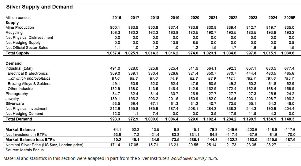 This article is an introduction to that story: where silver came from in the monetary order, what has happened to it industrially, why its supply structure is stranger than most people realise, and what the market data currently shows.
